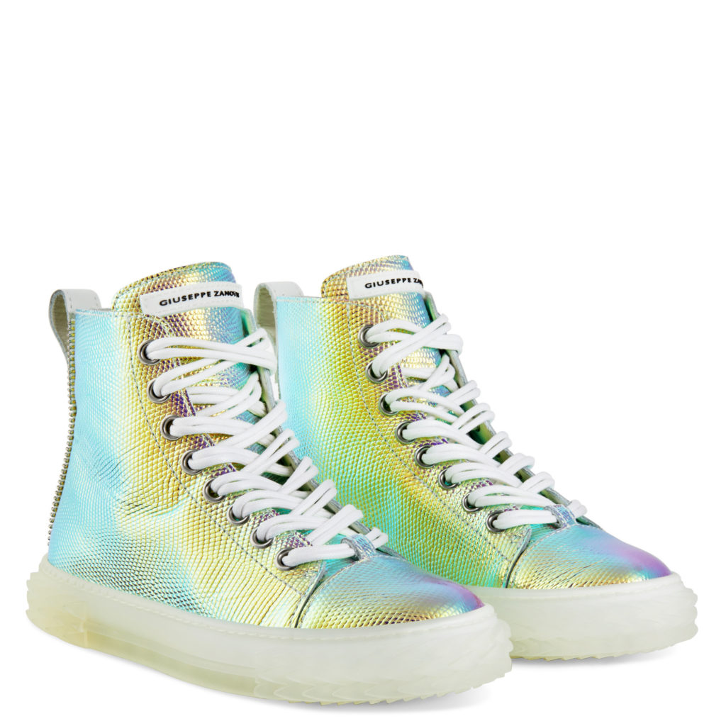 These mid-top shimmering, lizard print patent leather sneakers feature the Signature label and a tab on the back. They are set on a 'Blabber' rubber sole in matching colour, with logo.