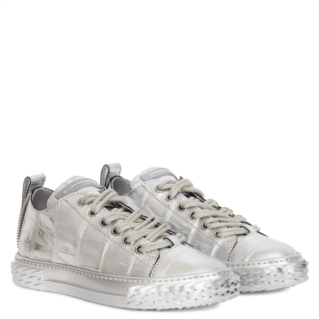 These low-top, crocodile print silver laminated leather sneakers feature the Signature label. The design is set on a 'Blabber' rubber sole with logo in matching silver.