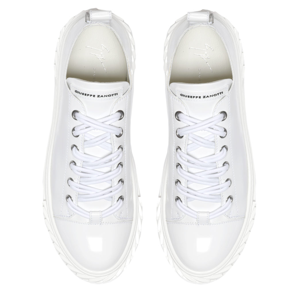 These low-top white patent leather sneakers feature the Signature label and a tab on the back. They are set on a 'Blabber' rubber sole in matching colour, with logo.