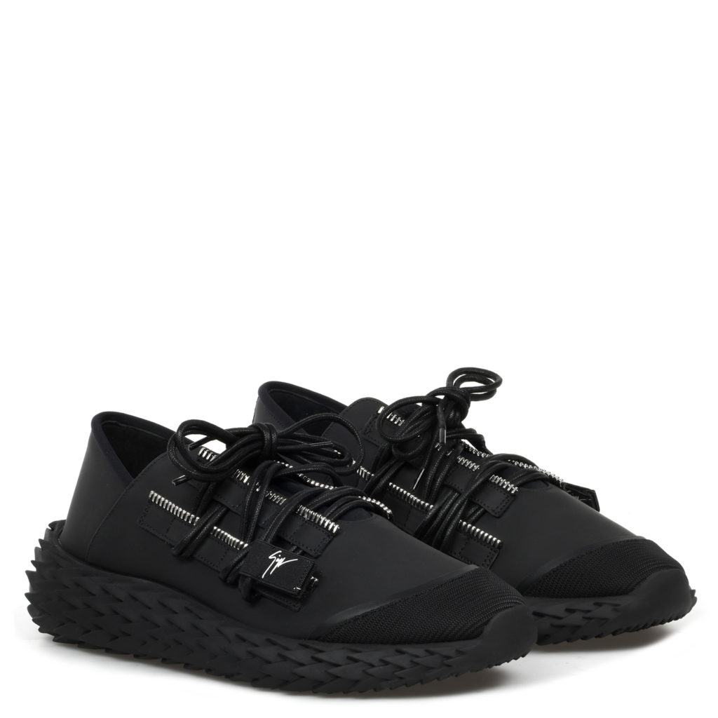 These low-top rubberized black leather sneakers feature a toe cap in technical fabric, in matching colour. The design is completed by the Signature logo and by the sculpted rubber sole.